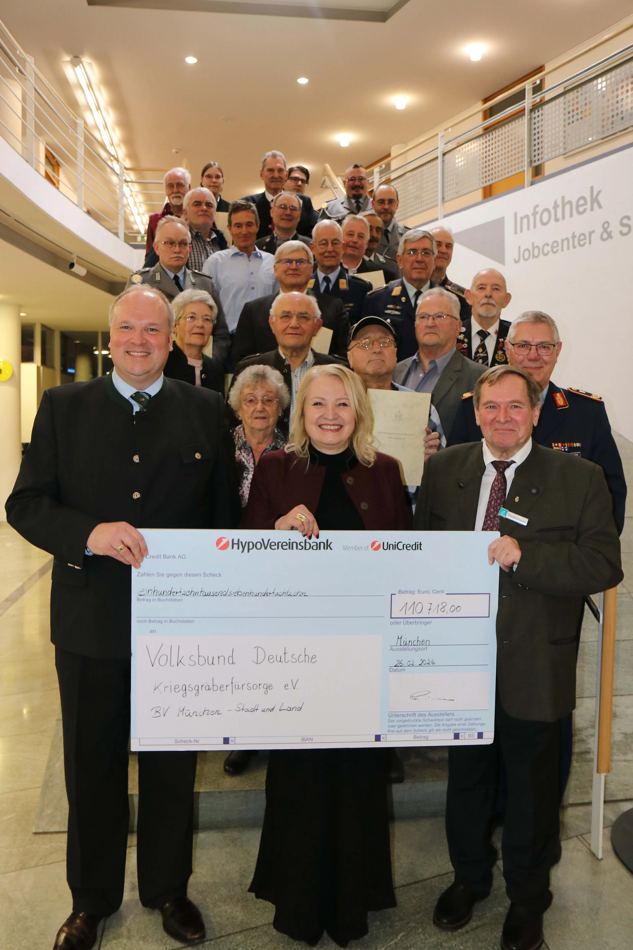 Gemeinsames Engagement für die Arbeit des Volksbundes: Landrat Christoph Göbel (vorne links) mit Stephanie Ritter, Geschäftsführerin, und Heinrich Stadelmaier, 2. Vorsitzender des Bezirksverbands München des Volksbundes Deutsche Kriegsgräberfürsorge, bei der symbolischen Scheckübergabe mit den geehrten Sammlerinnen und Sammlern, die gemeinsam mit zahlreichen weiteren Engagierten das starke Sammlungsergebnis 2025 erst möglich gemacht haben.